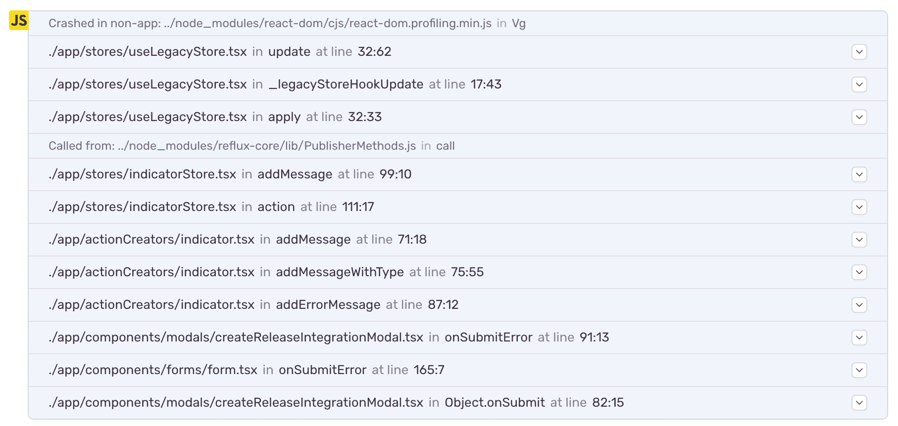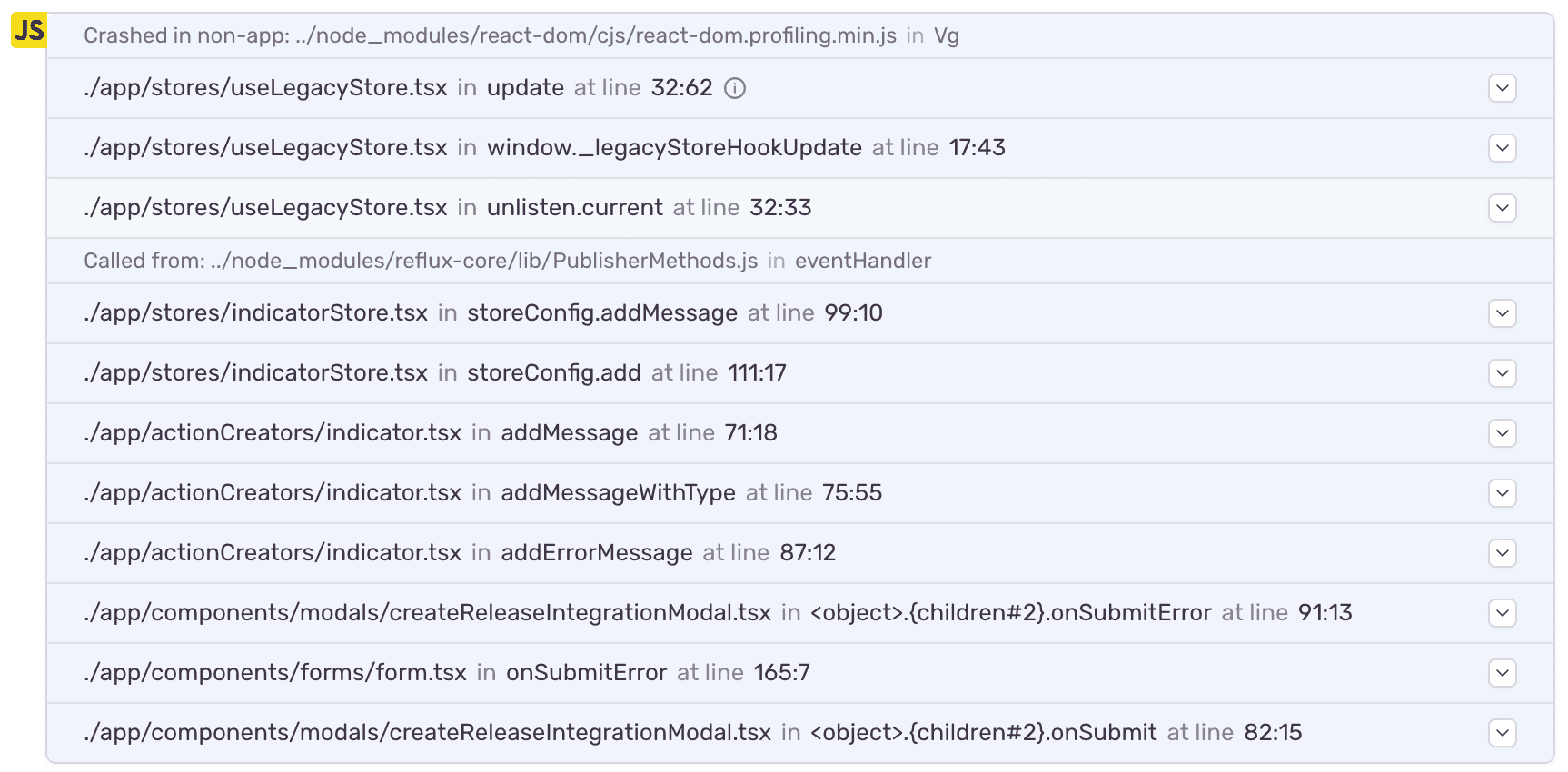 The following stack trace shows this even better. Notice how “apply” turned into “unlisten.current”, and the “_legacyStoreHookUpdate” now tells us that it’s bound to “window”. React components here also show an interesting effect. When callbacks are bound to complex structures, we would end up with things like <object>.children.children.children.onSubmit quickly. As a result, we detect duplicates and render them as {children#3}.